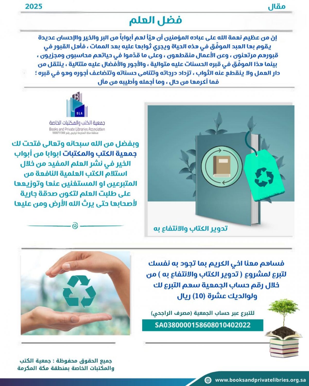 جمعية الكتب والمكتبات الخاصة هي جمعية ذات شخصية اعتبارية تخت اشراف المركز الوطني لتنمية القطاع غير الربحي ( مالياً ، إداريا ) وتحت اشراف وزارة الثقافة (فنياً )صدرت الموافقة على تأسيسها بناء على نظام الجمعيات والمؤسسات الاهلية الصادر بالمرسوم الملكي رقم 8 تاريخ 1437/02/19هـ مسجلة برقم 1000711300 تهدف الى تقديم الخدمات التالية